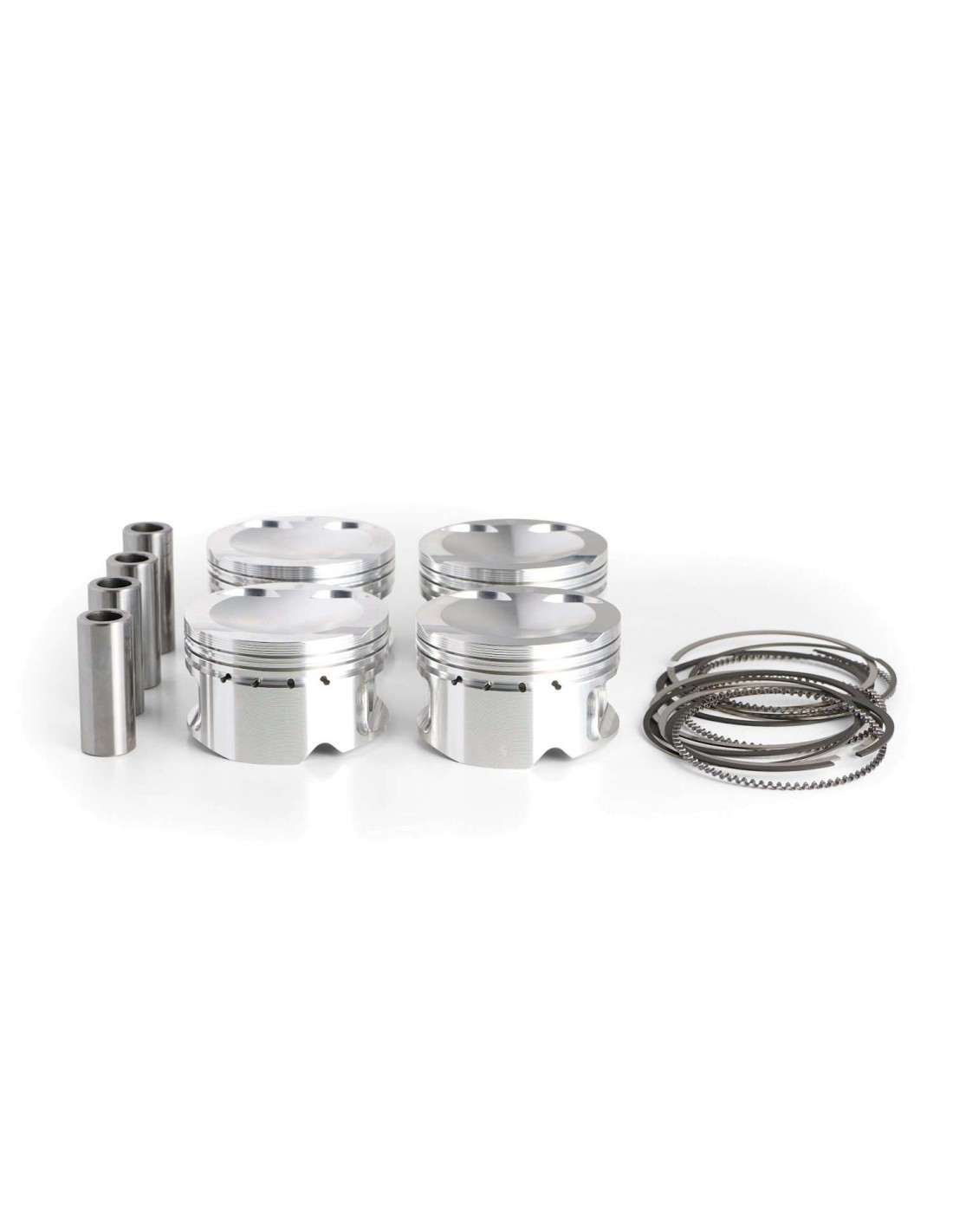 The Audi / VW 2.0L TFSI pistons are developed for mild to high tuning, mainly for road or club race cars that want to develop their engine for high mileage and/or street use. Designed by ZRP engineers and manufactured in Germany from 4032 (T6) high-silicon, low-expansion alloy. This allows the engine builder to run a closer piston to bore clearance thus producing a better seal. This minimizes the slapping noise during cold start, common place among engines running forged pistons, providing a quite operation and low oil consumption.We have chosen a Full round skirt design with bottom reinforcing band, with oversize and deeper valve pockets to allow high lift camshaft profiles to be used. They have Offset pins for quiet operation and the wrist pins are made from 9310 alloy. Other features include Anti-detonation grooves to protect the first rings, gas pressure accumulator groove for better ring seal and vibration relieve. Premium Japanese quality 1.00mm x 1.20mm x 2.80mm ring package included.